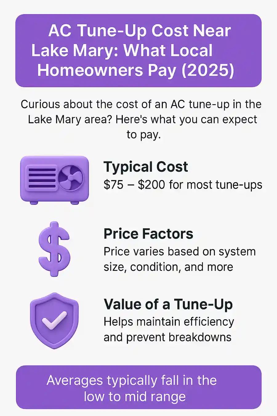 For homeowners in Lake Mary, AC tune-up costs in 2025 typically range from $100 to $250, depending on the size of your system, its age, and whether additional services are needed. At FilterBuy, we’ve observed that most local HVAC companies charge a flat fee for basic maintenance, which usually includes cleaning coils, inspecting refrigerant levels, checking electrical components, and testing system performance.
