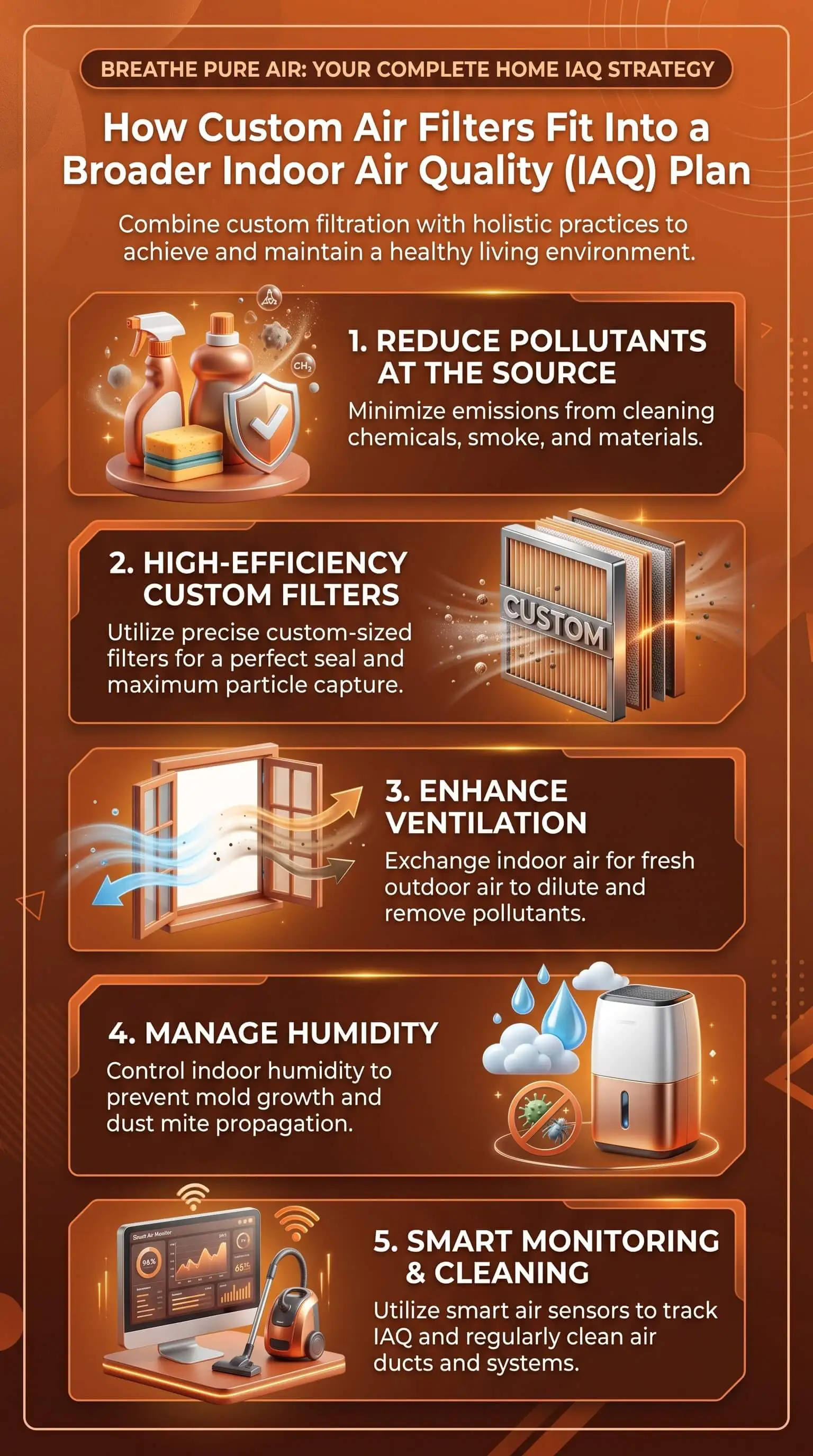 A complete indoor air quality plan has five layers: filtration, ventilation, source control, humidity management, and monitoring. Custom filtration makes every layer above it work harder for you.