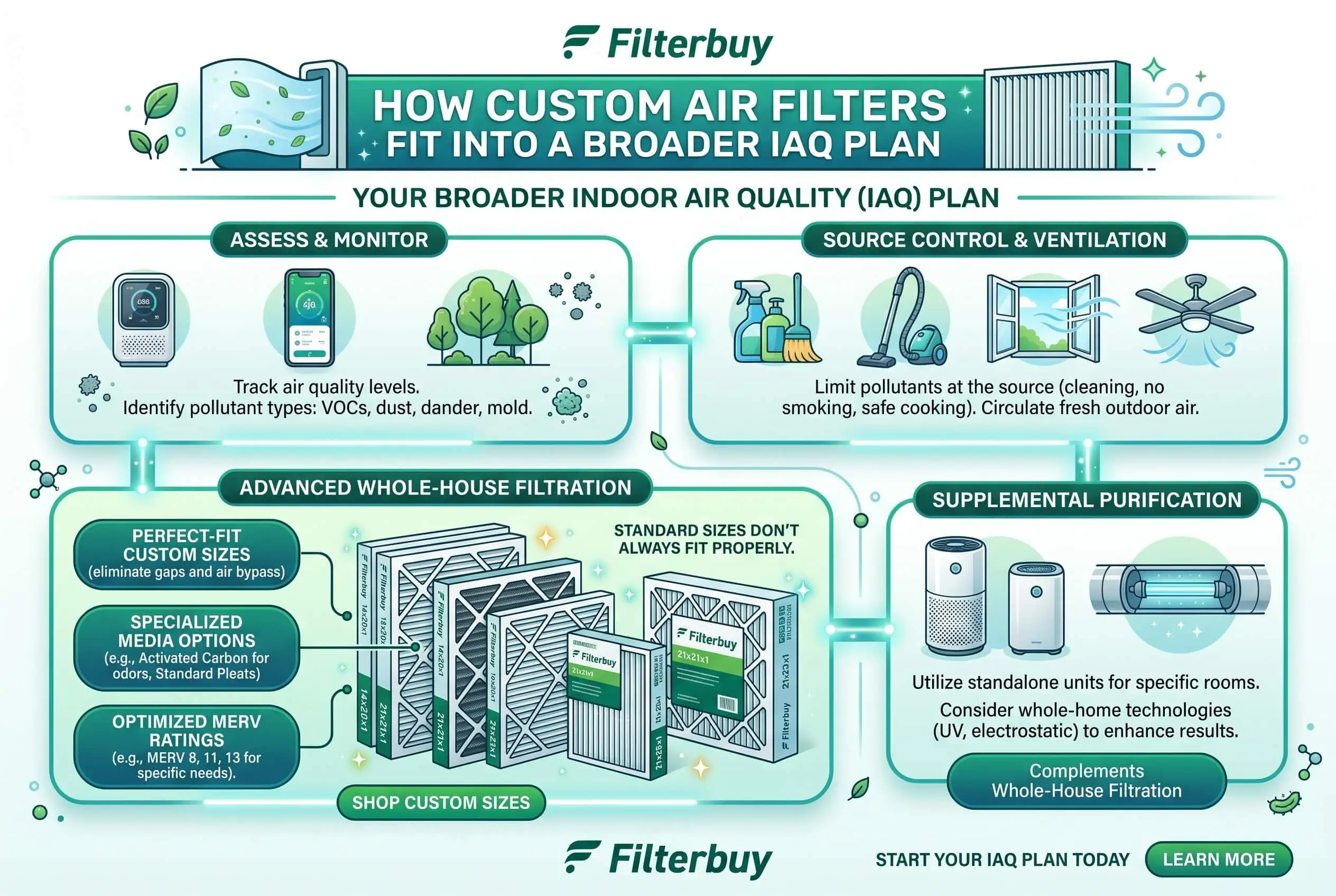 This page walks through how custom air filters fit into a broader indoor air quality plan, when off-the-shelf sizes fall short, how to match MERV to your household, and how to set a replacement cadence that actually holds up.